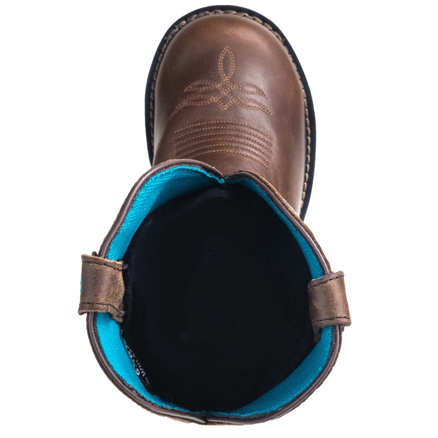 These 11-inch women’s pull-on boots feature rugged chocolate chip brown leather uppers with turquoise and cream stitching on the shaft. With Justin’s own brand of tough waterproofing built right in, your feet will stay dry in these cute leather women’s boots. Easy to pull on with the leather finger pulls at the top, these brown leather cowboy boots add some style to your work day or chore time, and they’re ready for anything the job throws at you. The round Gypsy steel toes offer plenty of room for your comfort and even more strength to protect your toes from compression or impact. Safety is a priority for your and for Justin boots, who won’t let you down when you need them.