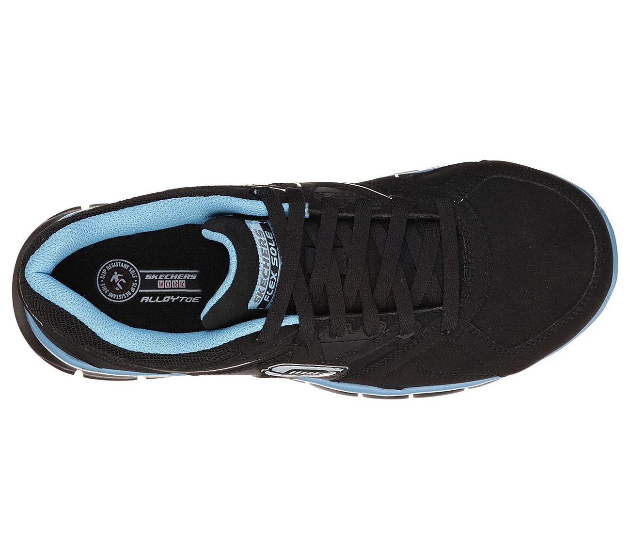 The black and blue alloy toe shoes feature Skechers slip-resistant traction outsoles for superior grip on uneven and slick surfaces. The slip-resistant flexible rubber traction outsoles include 1-1/4-inch heels for superior stability, and FlexSole shock-absorbing lightweight flexible midsoles doe their part in supporting your feet, too. Stabilizing heel overlays plus Memory Foam topped cushioned removable comfort insoles make for a great team, as they support and cushion your feet properly.